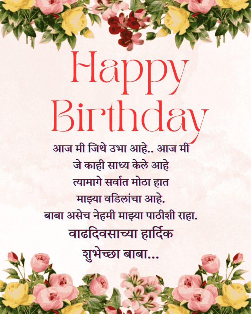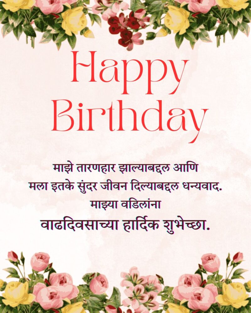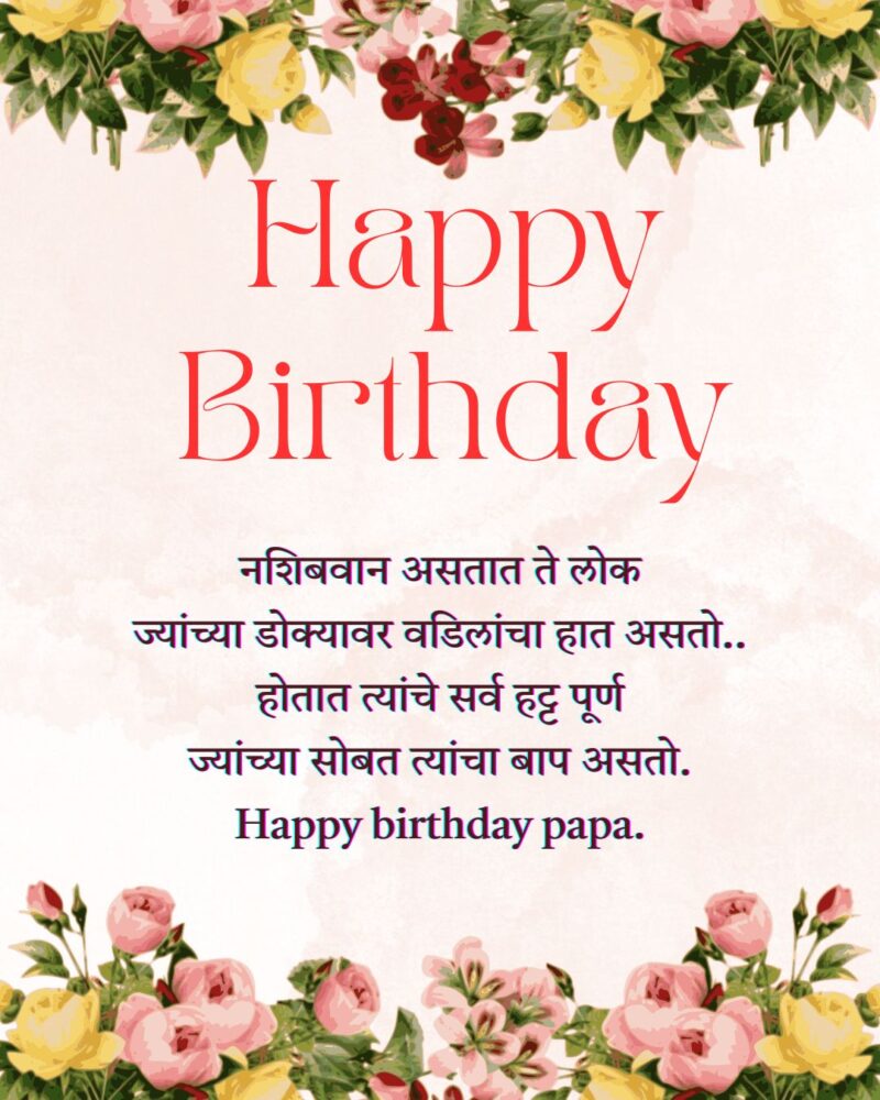 Birthday Wishes For Father In Marathi | वडिलांसाठी वाढदिवस शुभेच्छा संग्रह:- वाढदिवस साजरा करणे आयुष्यातील काही आनंददायी क्षणांपैकी एक आहे. जेव्हा आपल्या वडिलांचा वाढदिवस असतो तेव्हा आपला आनंद द्विगुणित होतो. तुम्हाला तुमच्या वडिलांसाठी वाढदिवसाच्या खास शुभेच्छा संदेशांची | Father birthday wishes in marathi आवश्यकता असल्यास, तुमच्यासाठी येथे काही वडील वाढदिवस कोट्सचा संग्रह घेऊन आलो आहोत.